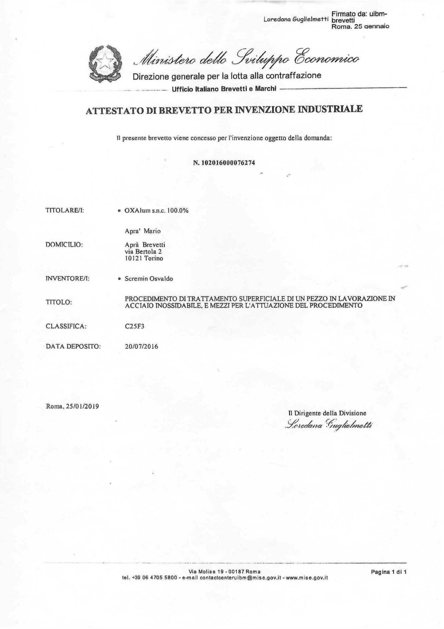 Brevetto 102016000076274 - Oxalum snc